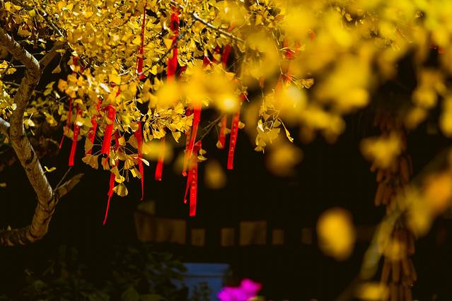 这个小镇的秋是最美的,一片片金黄色的古银杏树里里外外,错落有致地包围着,村中有林,林中有村。山风穿林而过,银杏树叶便离开枝干,铺天盖地,纷纷扬扬地飘舞在村中的每一个角落。田间地头,小院门前屋后,到处都铺满了金黄色的树叶。牧童赶着牛从金黄落叶上走过,此时走进小镇的村落,便仿若来到了童话世界。
