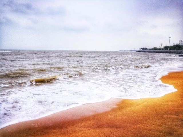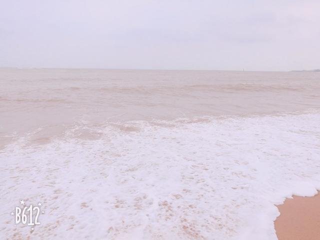 沙子有点粗天气不好,海风也有点大,海风有点咸腥味,海水卷着白色的浪花不断翻滚。