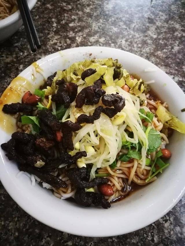 米线淋上特制甜咸口酱料,花生,肉干,酸菜,豆芽。