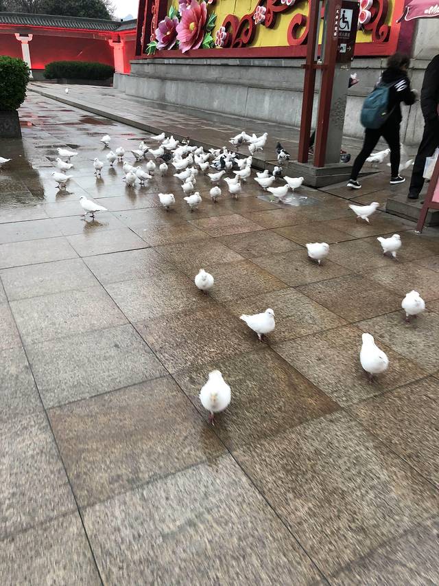 门口很多胖鸽子,走起路来都是一顿一顿的,基本不怕人。可以花5元买饲料喂它们。