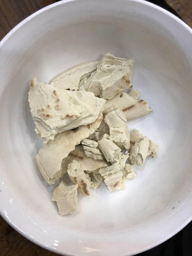 一份优质牛肉泡馍28,一份荤素凉拌拼28(右上角,一荤两素,牛蹄筋+黄瓜+莴笋)。先拿着自己的馍开始掰小。