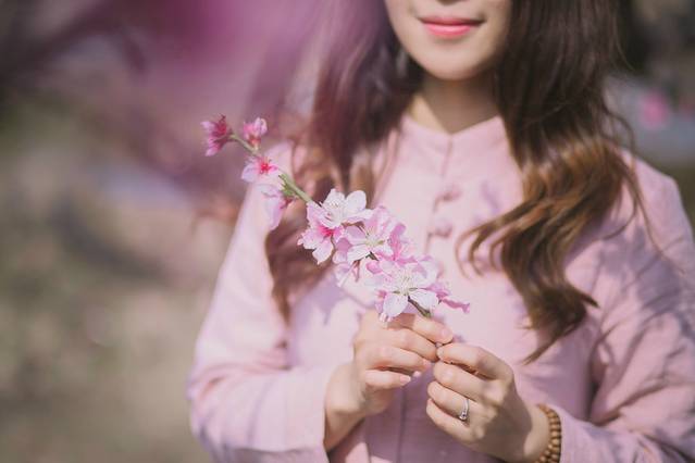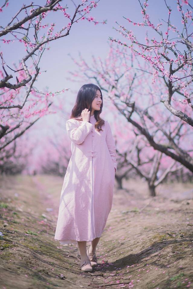 穿着一袭粉色长裙的小伙伴自然是这桃花林里最生动的点缀,当微风吹起裙角,再好的风景都不如你眼角羞涩的笑意。
