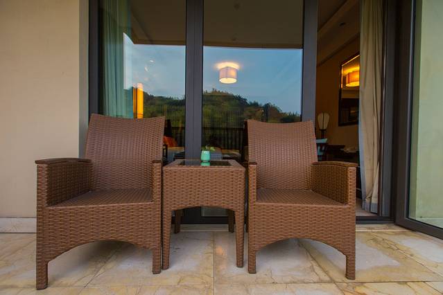 推开房门,阳台上有两人藤椅,可以在这里舒适的吹吹风,喝喝下午茶,再惬意不过了!