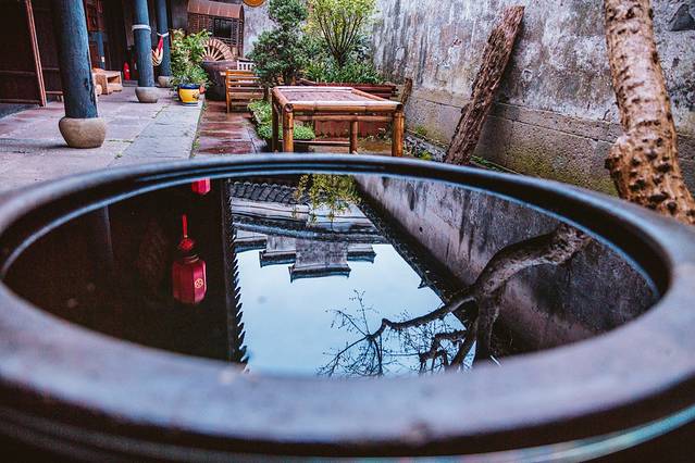 水缸里的倒影宛如一副纯天然的水墨画一般。