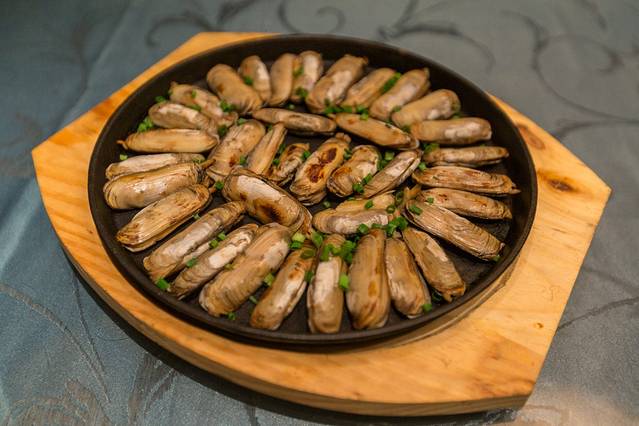 我最爱的当属这道堂做铁板蛏子,只用了酒和盐,师傅是上个央视“味道”的厨师哦,现场给我们先做的,刚上桌时香飘四溢,用蛏子蘸上一点酱油,再吃上一口,感觉全是幸福的味道!