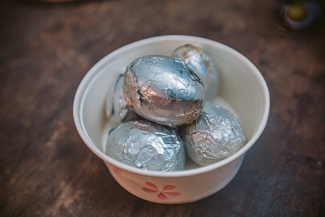 还有被当地人称为“网红蛋”的咸蛋。做法很别致,将鸭蛋敲开倒出蛋清,再把糯米和菜塞进去,用锡纸包裹上,蒸煮熟后就成型了。