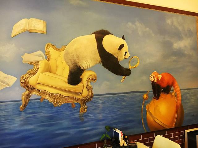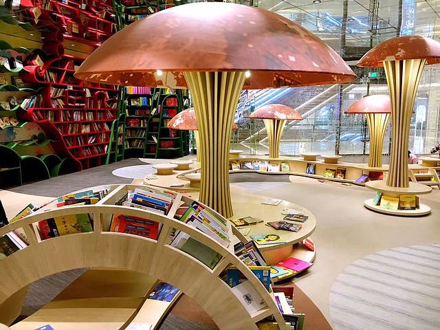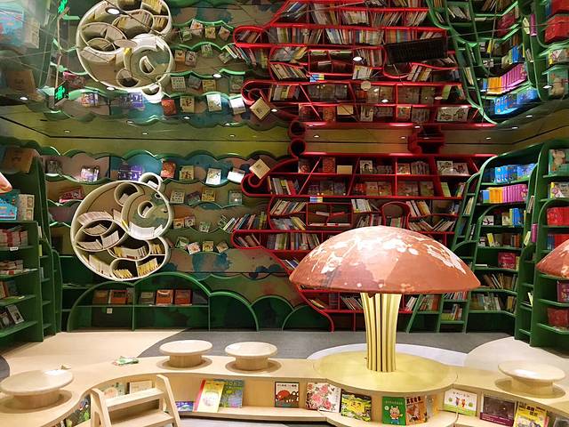 四周都是熊猫状的宝塔和书柜,从地板延伸而上的蘑菇造型的书架打造出了一个森林王国!