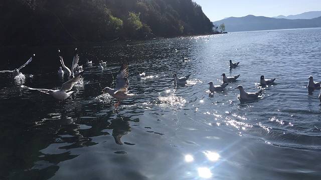 水里的海鷗 在嬉戲著,可惜我們前一天晚上就准備的面包 划船的時候忘了帶出來喂它們,不然它們會一直跟著我們飛。