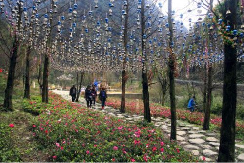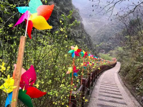 还没走到碧潭幽谷,就听到了叮叮当当的风铃声,放眼望去,上万只风铃在春风中摇曳,特别美腻。风铃组成的铃音大道,还有彩色的风车在道路两旁,煞是好看