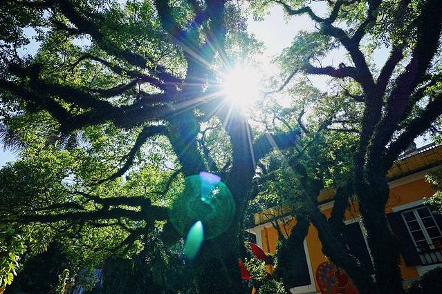 前有一小庭院,植有两颗巨大的百年老樟树,