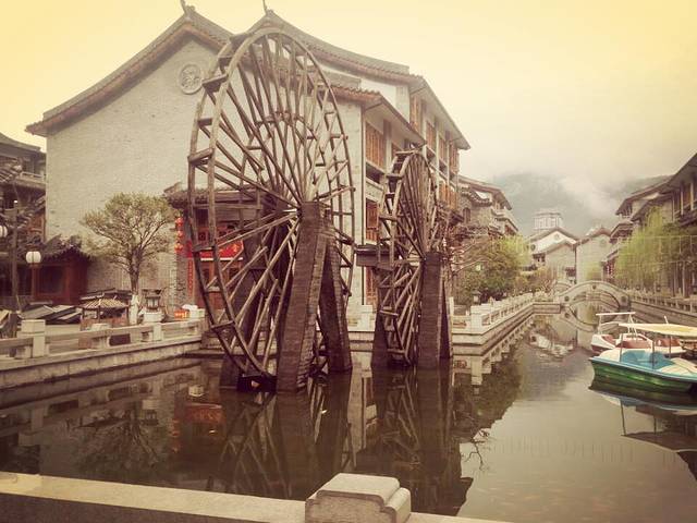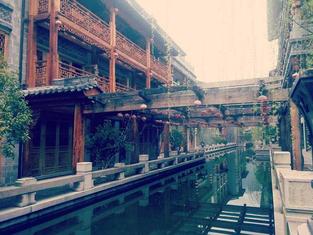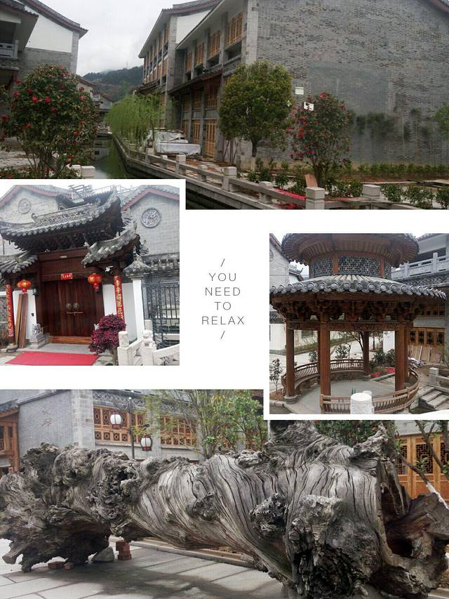 走进古镇,你的第一眼便会定格在广场中心左右两边各竖起的四根石柱之上。柱子的顶端雕刻着畲族的四个姓氏,雷,蓝,钟,盘。相传畲族始祖盘瓠立下奇功及其不畏艰难繁衍出畲族子孙的传说。柱身上皆是对传说用图文的方式的一种表达,刻画的唯妙唯俏,栩栩如生。顺着视眼往前看,花坛正中央立着的便是浮丘伯的石像。他是秦汉时期从旧儒学到新儒学发展的重要人物,曾携双鹤隐居于鹤溪。石像的周围便是小镇的房屋,一座座飞檐翘角,雕龙刻凤,每一座都有自己的独特之处,不尽相同。整个古镇的中心有一条河穿流而过,河边上便是一排排刚长了新芽的垂杨柳,河内的双轮水车在流水的带动下缓慢的转动着,发出吱丫吱丫的声音,仿佛一个垂垂老矣的老人在耳畔低语。河里的锦鲤像是受到惊吓般一下子游开了,不过若是看到人靠近河边,便会蜂拥而来,仿佛知道下一秒便会有人给他们投下美味佳肴。鱼食一投进去,它们便争抢起来,有的甚至会跳起来,看来这群锦鲤也是一群贪嘴的家伙。