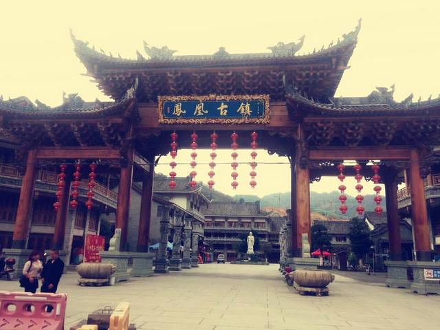 站在凤凰古镇的大门面前,我却一下就被这座门楼的飞檐翘角、实木椽的搭建方式所吸引。它采用的是一种仿古宋代的建筑风格,门楼由八柱三排的双牌楼组成,蔚为大观。