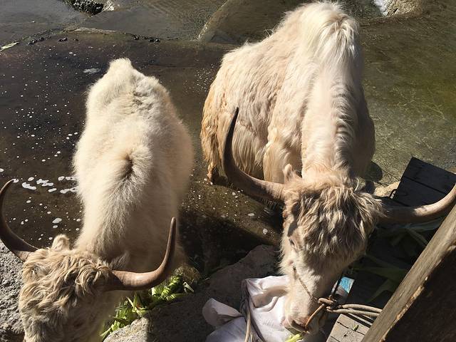 比较不愿意接近人的牦牛。景区内有提供游客拍照的牦牛,民族服装租赁。
