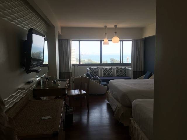 返回今晚住宿的地方,今晚住宿的地方是昨晚应该入住的,这个是我最喜欢的一个住宿点,因为靠海很近,住宿的房间是可以看到海的,房间的装修也是蓝色海洋的颜色,很喜欢。。这次住宿的也不例外,卫生间有浴缸和淋浴房,进门的衣柜里面有两件浴袍,反正我们是没有穿的啦,衣柜是智能的,打开后他里面的灯会自己亮开,衣柜里面有一个保险箱,供入住的客人使用吧,我们也没有用的上。往房间里面走,有一个大大的镜子,再走,有个五斗柜,再就是大大的镜子和一个80厘米左右高度的放了水杯和烧水壶的等的桌面,正对面有2张床,一张大床,一张相对小的床。中间有一个智能调控,有2边床头灯的开关,房间内的走廊的开关,空调开关等。再有就是在大大的窗户那边有个茶几和一张沙发,和2张椅子,打开窗户望出去是海,和闺蜜坐下来聊聊天,看看海很是惬意,那晚我们聊聊聊很多很久,可能好多东西都记不清楚了,可是印象中那晚我们聊了一些之前没有聊过的一些比较掏心窝的话,,哈哈哈,回忆起也是很美好的场景。