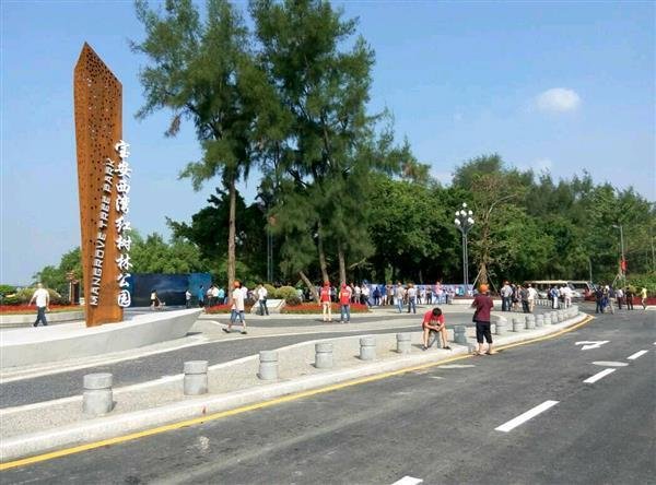 西湾公园是集休闲、游憩、科普于一体的高品质滨海景观公园。以“多彩西湾,活力生活”为主题,观海平台由三座“船锚”形的观景平台及栈桥组成,每座“船锚”呈弧形展开,取意“新月倒影,拥抱游人”。三座“船锚”弧长分别约65、45、60米,平台面积约700、300、340平方米,与海岸由宽度约3.5-4米的栈桥连接,可容纳约2200人观景。西湾公园整个工程分三期建设,建成后将拥有绿道主环线9.3公里,滨海栈道约7.5公里,湿地公园约53公顷,滨海红树林带20公顷。