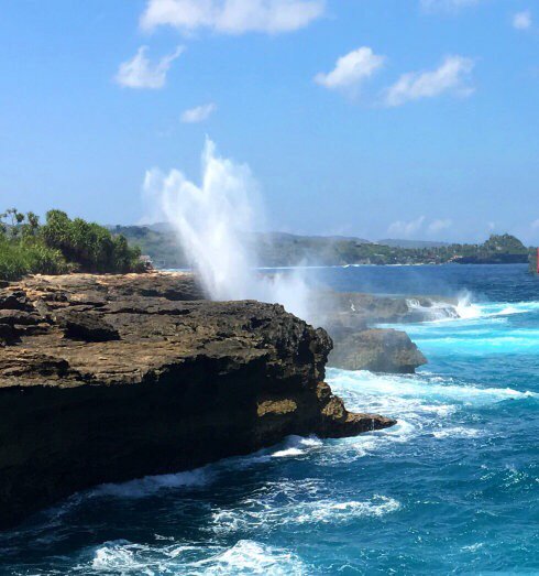 最最期待的一天,南梦岛之旅,我们要去看恶魔的眼泪。前两天在飞猪上自己订的南梦岛一日游680/人。蓝梦岛是属于巴厘岛的一座离岛,位于巴厘岛东南边,恶魔的眼泪(Devil's tear),实际是一个小的悬崖,在海水的不断冲刷下,形成了一个接近半圆形的豁口。悬崖底端的洞穴与海水压力的配合,造成20米左右的海浪,同时击打在崖口形成大片水雾,折射阳光呈现彩虹。我们运气很好,在这里看到海龟在大海里游泳。