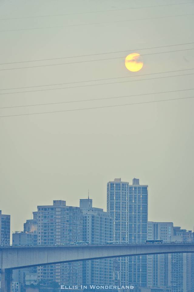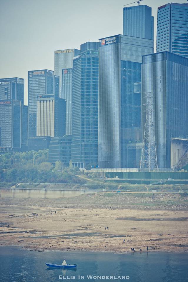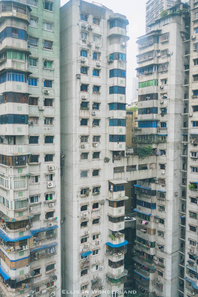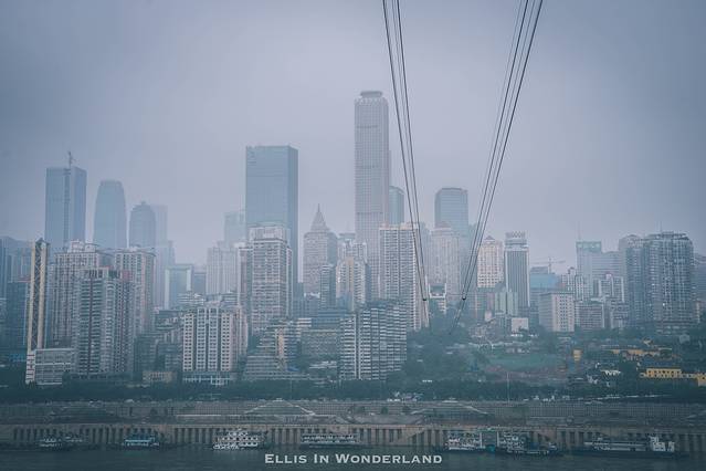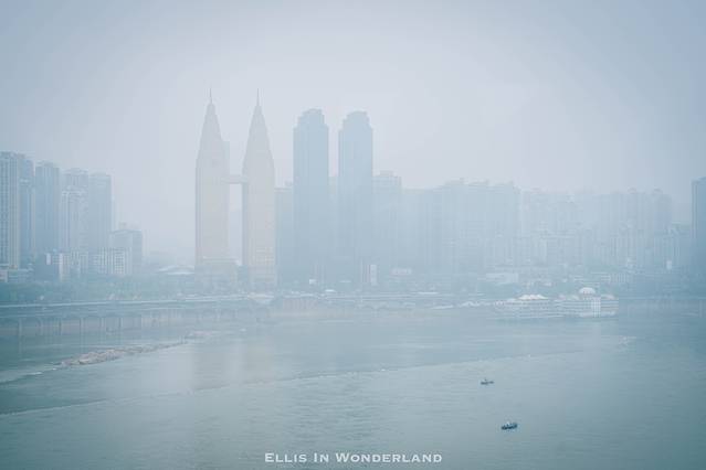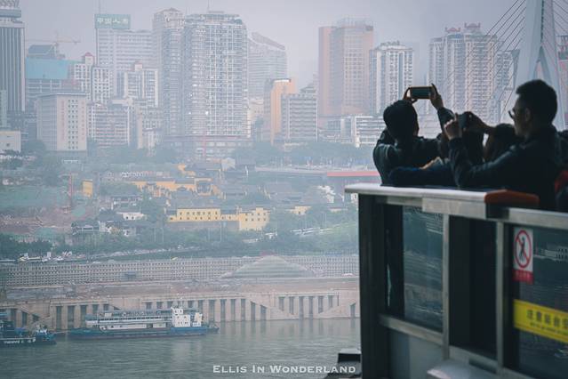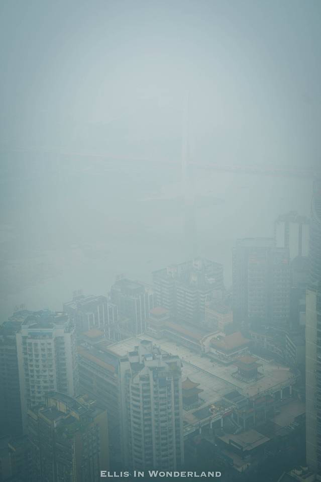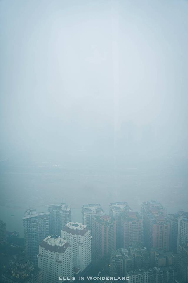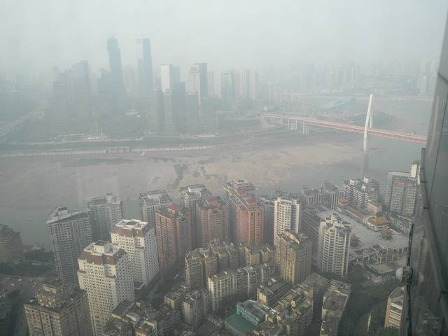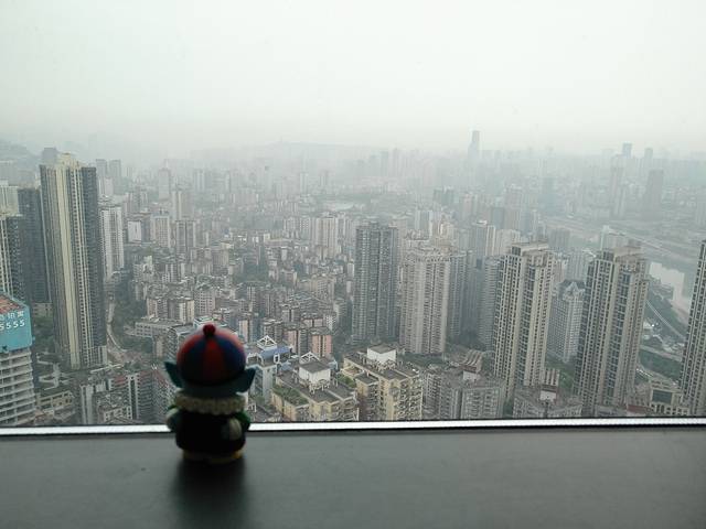 重庆的摩天大楼多,所以登高望远的事情一部分可以交给酒店,只是隔着玻璃窗没法拍照。我们这次住了跟万豪在一栋楼里的天慕酒店,楼层在万豪之上,view还不错,可惜天气……你懂的。