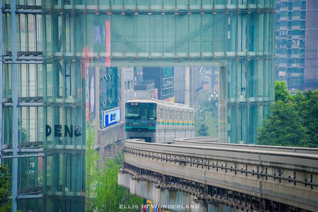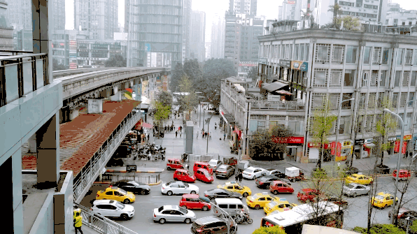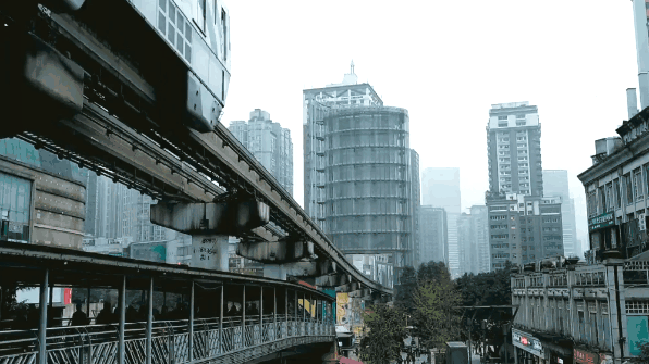杨家坪也在2号线上,是没有做到过攻略偶然发现的一站。在这里,轻轨也会穿楼而过,而且穿的是一栋剔透的玻璃建筑,很有未来感。而古朴的过街天桥、叫卖的高音喇叭和周围建筑的风格,又仿佛出自上世纪末的某个大城市。除了极少数的游客,过往的行人大多对穿楼轻轨见怪不怪面无表情,让人怀疑时空经过碰撞和断裂,在这里重新衔接,而淡定的行人,是看不见那来自未来的列车的。