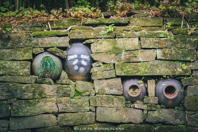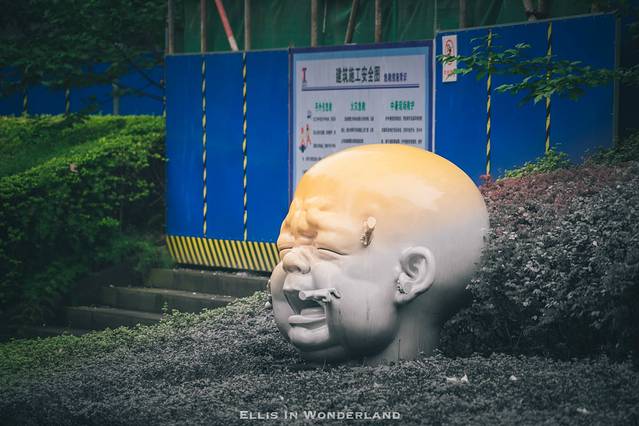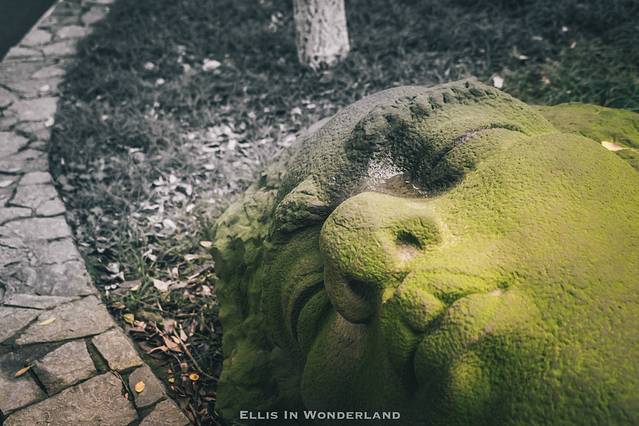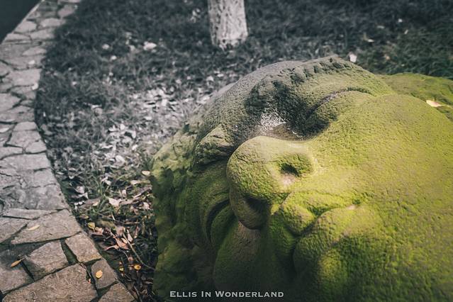 覆满青苔的人物头部雕塑,眼窝处刚好汪住刚下的雨水。朋友别哭……