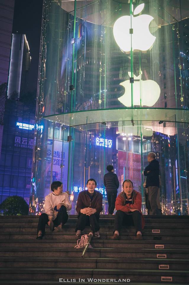 解放碑的夜晚很热闹,苹果店的楼梯晶莹透亮。门前坐着几位休息的劳动者,最左边可能是位商场里的保洁,中间是重庆最具特色的职业“棒棒”,右边的辨认不出。看着这样热闹的夜晚,不知道他们彼此陪伴着,在惦念着谁,关于生活有什么样的憧憬。