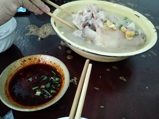 胡蹄花是川美老校区附近的网红店,我对猪蹄没什么执念,但因为要去川美,不吃白不吃,就去打卡了。一大盆蹄花汤端上来,90后老阿姨老泪纵横地看到了满满的胶原蛋白。这可能是唯一一顿菜本身不带辣的饭了。而在汤之外,老板还是给上了辣椒碟,用猪蹄沾着吃。蹄花汤强推,猪蹄软烂、汤头浓郁,我这种爱喝汤的人面对着一锅锅不能喝的火锅汤底绝望的心情,都是靠这盆蹄花汤挽救回来的。