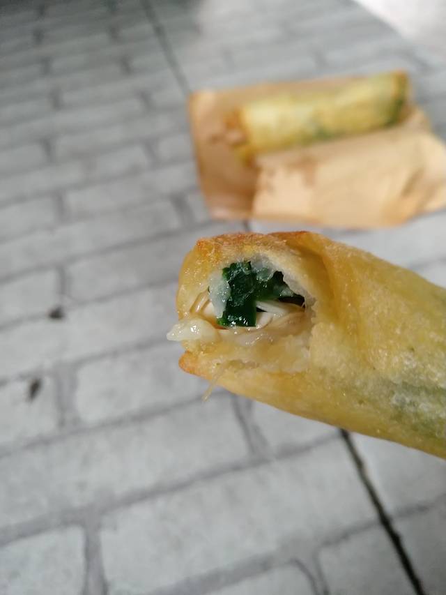 “老外婆春卷”据说也是个网红。我们刚好路过,10块钱4个,有咸口和红豆的。我本来不想买,可是橱窗后的阿姨笑容满面地用甜甜的声音招呼我,座位上用餐的小两口也不住地帮忙揽生意,我就走不动了。买了四个传统口味的,内馅有韭菜、豆干、豆芽,比一般的春卷大很多。我想问问老板娘,为什么要坚持在这看店,看她忙里忙外的样子,却问不出一个字。