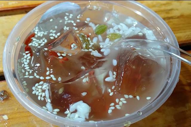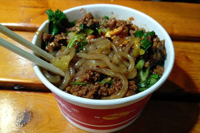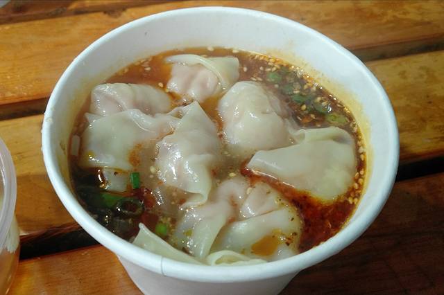我们晚上回酒店时数次经过了较场口夜市,却在最后一天的早上翻了它的牌子。冰粉、酸辣粉、老麻抄手和山城汤圆是我们一顿早餐的量,都在佩姐火锅附近的那个“好又来”解决的。抄手和酸辣粉的味道都不错(吃酸辣粉时旁边坐了一位东北美女,一口乡音说得我分外想念酸辣粉配烤冷面的搭配),汤圆的馅有点颗粒感,像元宵的内馅。冰粉嘛,欣赏不了……