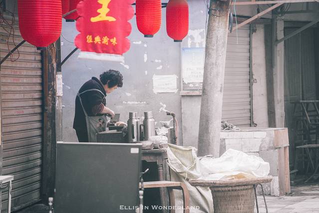 现在重庆的大街小巷还有很多这种用扁担调着东西卖的小贩。拍照时,后面的建筑围墙侵略似的,怎么都避不开。我们酒店出来之后走几步路就有一个大水果超市,门口常常有个大爷身边放着两筐水果,用小刀一下一下地削荸荠,生存在大超市和精品店的夹缝里。随着高大干净的店面越来越多,小贩这样的职业会消失吧,就像都是中老年人做的棒棒,这一代之后,也不会再有新的血液了吧。这样的职业消失了,那些原本做这些职业的人去哪了呢?这个城市关于他们的记忆,也会褪色消失吗?