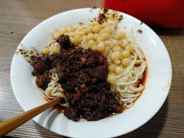 大家都说,重庆的小面,随便找一家就好吃,不要迷信网红。可是我们刚好就住在网红附近,于是来体验了一把重庆人刺激的早晨。花市豌杂面在渝中貌似有两家,店面大的没什么人气,店面小的总是大排长龙,我们当然去了小的。味道嘛,好吃!我也想不出什么特别的词汇去形容它的味道,就是扎扎实实的一碗面,麻麻辣辣的,肉酱有点咸有点香,辣子的味道怎么都吃不够。翔哥点了牛肉面,他说没有我的豌杂面好吃。不过这家的豌豆是颗粒分明的,跟我之前在纪录片里看到的煮的半烂的豆子不太一样。