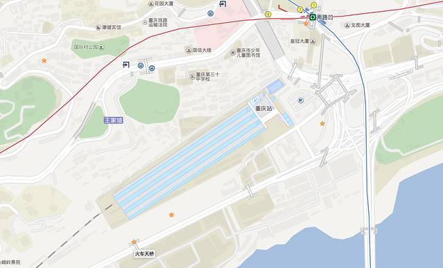 Tips:天桥与两路口和火车站的相对位置如下图所示“火车天桥”,但我觉得并不是最好的拍摄位置,有兴趣的可以在附近几幢高楼看看能不能拍