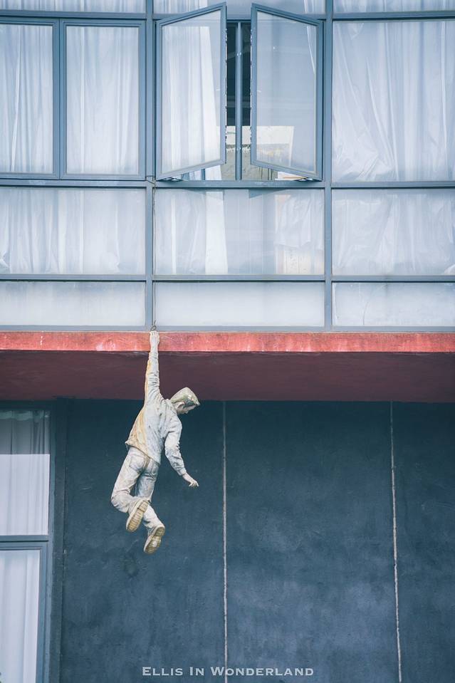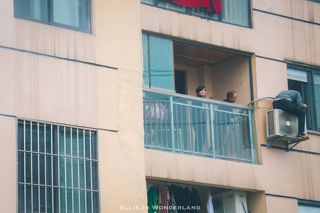 在索道上,不仅能看到华丽的风景,还能看到寻常人的生活。一个人骑在空调主机上修理,下面就是二十多层楼的高度。