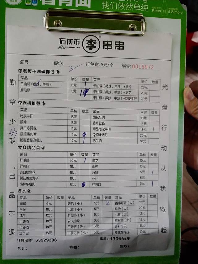 这家店的环境着实很一般,像小学附近的脏串儿店,靠着吃货的养活,根本不用在意门脸。我们当天大概是2点多到的,还排了半个多小时的队(老板娘跟我们说要排十多分钟,所以排队时间要根据她说的乘以2甚至3)。快排到的时候,老板娘会给一张菜单,上面有一些单点的东西,但实际上串串的都是在屋里自助取的,所以菜单上的东西不要点太多。