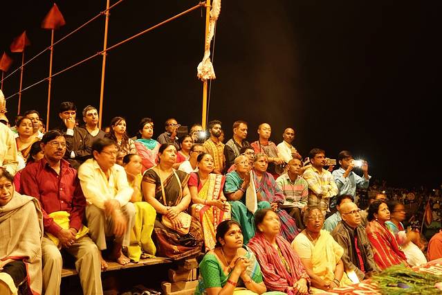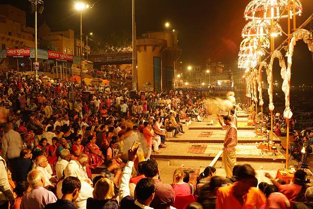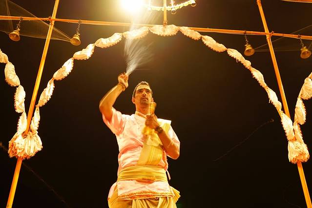当阳光的最后一缕光辉消失在天际,信徒们会如潮水般涌入到恒河岸边的主码头。随着清脆的铃声,在首席祭司的引领下,众祭司面对恒河站成一排,一脸的肃穆与庄重。他们怀着一颗虔诚心,缓缓举起数千年流传下的圣火,在祭台上吟唱。
