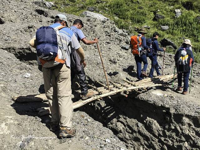 有一段山体滑坡路段,泥沙中混杂着冰块,走起来要分外小心。 还有下图一段裂谷,走起来还是有点都方