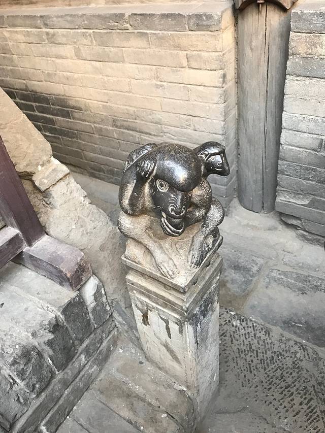 这个石雕是在幼儿学堂,为什么小猴子要捂住耳朵呢?因为王家长辈希望子孙们两耳不闻窗外事,一心只读圣贤书。
