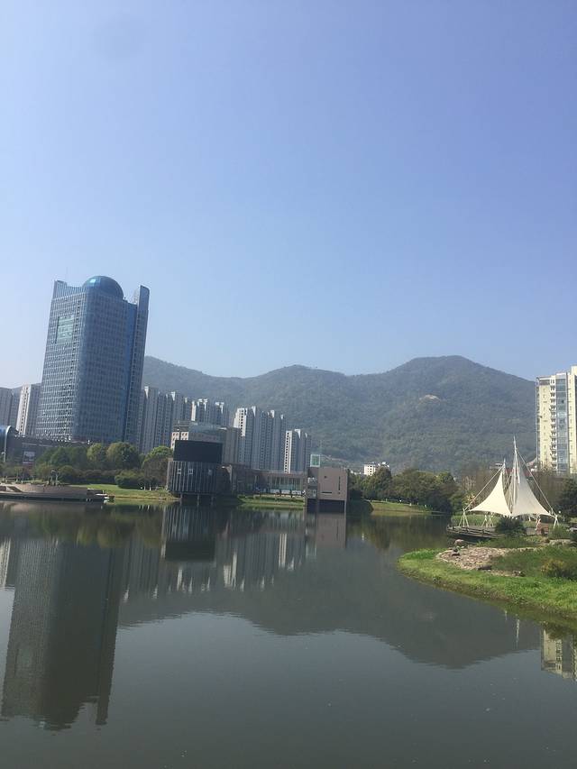 这是工作完成后经过心湖公园时,太阳出来了,雾气散掉,揭开面纱后的新三门!