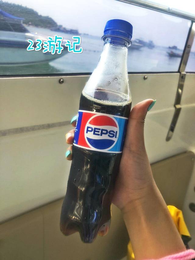 在船上,导游会发两次水。第一次矿泉水,第二次可乐。这个可乐不向国内的那么甜,而且不粘手。为啥我知道不粘手呢?┭┮﹏┭┮因为我喝的时候一个浪打过来,就洒在了我的身上。。。