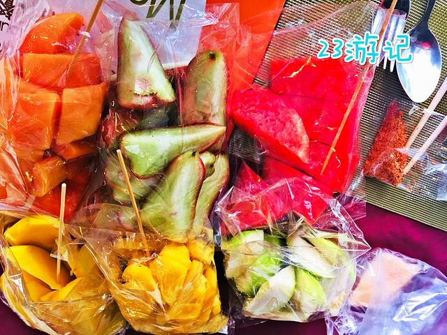在我前面提到过的big horn restaurant那家餐馆,往前一直走都是夜市的范围啦。路边有很多按摩的,吃饭的,卖东西的,水果呀,便利店呀,药店呀,商场呀都在这边啦。晒一下这边夜市我们吃的东西吧。