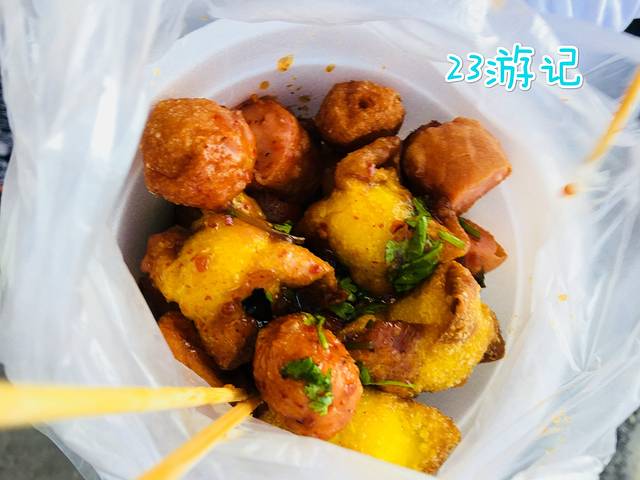 这是炸串,这些路边摊到晚上的时候就都没有,被清走了,如果你4,5点过去能找到