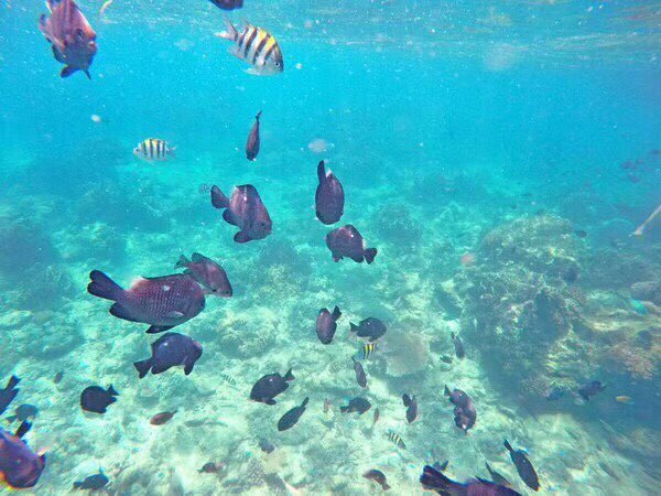 有了救生衣和呼吸管,直接下海,带上浮潜面具,弯腰并且撅起屁股,直接将头埋入海水中看看周围的鱼群,非常美妙~