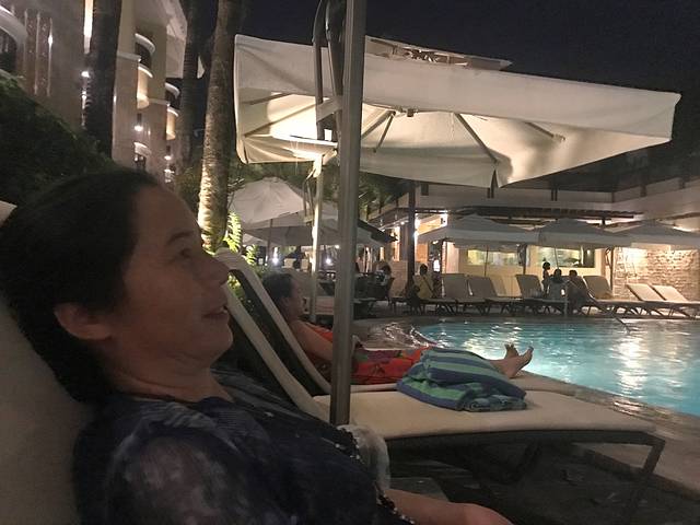 我妈这个旱鸭子,显然很享受这歌泳池带来的舒适感。