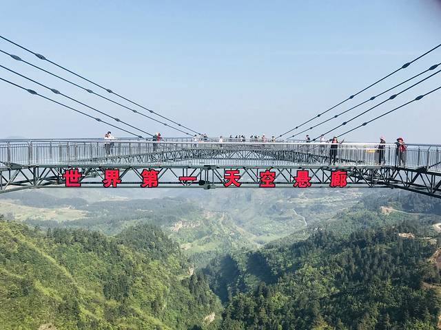 2017年成功的申请了吉尼斯世界纪录~最长的悬挑空中玻璃走廊,玻璃走廊悬空于数百米高的悬崖峭壁之上,沿悬崖向外挑在八十多米的空中,所以名为天空悬廊。廊桥成“A”形,桥面铺设全透明玻璃,从内往外由宽渐窄,站在廊桥最顶端,有一种一览纵山小的豪气!