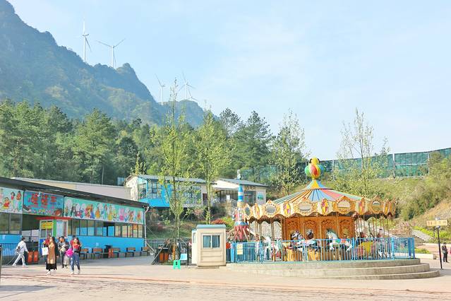 这是西南地区首条全透明高空玻璃吊桥。在300米高空的上,跨度150米的玻璃吊桥形成一条让人惊吓到哭的空中通道。虽然宝宝受到了惊吓,但还是举步维艰的小心通过了,桥上还可以欣赏到不一样的喀斯特地貌美景。听工作人员说,园区内正在建设民宿,试想在山间绿野里进入美梦,听起来好像很不错诶!
