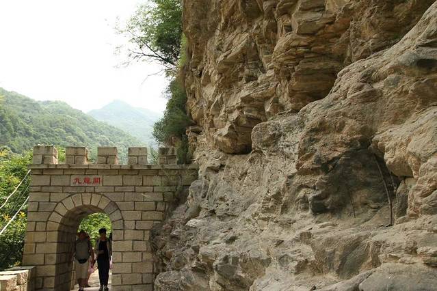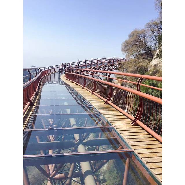 第一站索道服务区,下车后乘坐索道上去,下了索道后有两条路可选,一条平坦的路,一条往更高处爬的路,两条路都可到达玻璃栈道。建议走平坦的路,留些力气和时间去石门景区逛。走平坦的路二十分钟到达玻璃栈道,天生胆子大,没有被吓到,哈哈,玻璃栈道目测70来米吧, 分为两段。最顶端的龙首阁还没开放,有些失望。 随后去了玻璃栈道上方的潜龙寺。传说是刘秀在这里避难过,有个两千来年的历史了。