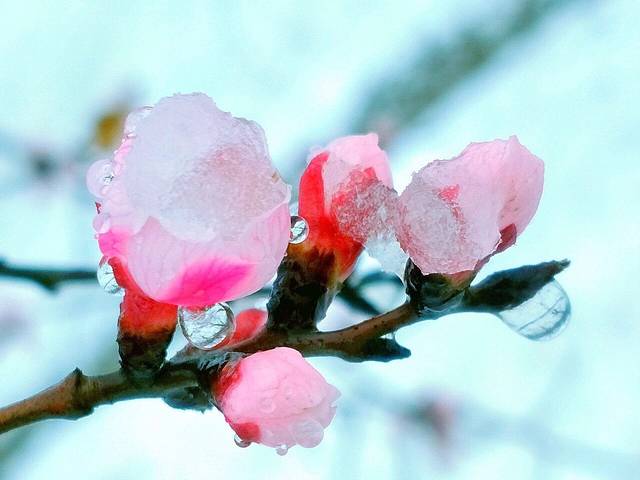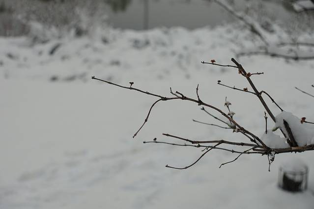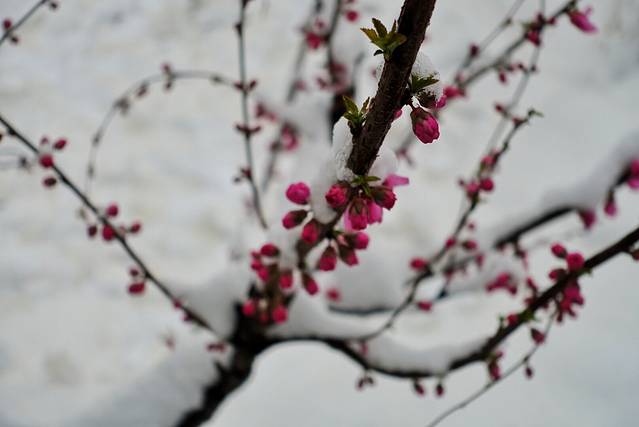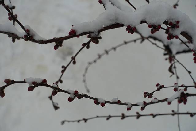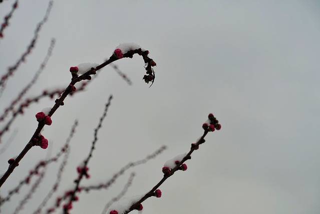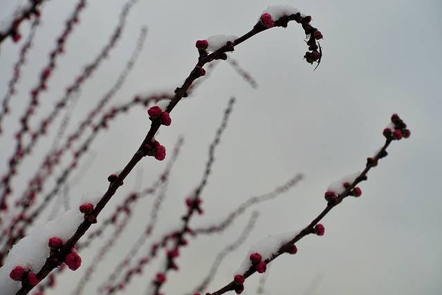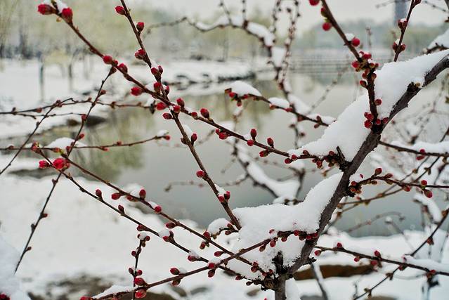 有了白雪的衬托,桃花显得更加娇艳。虽然只是花骨朵,想必盛开时也是人间好颜色吧。