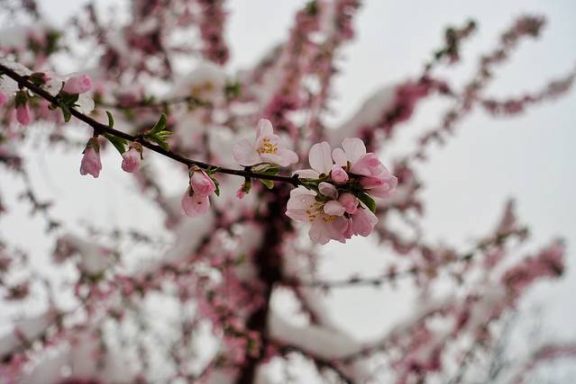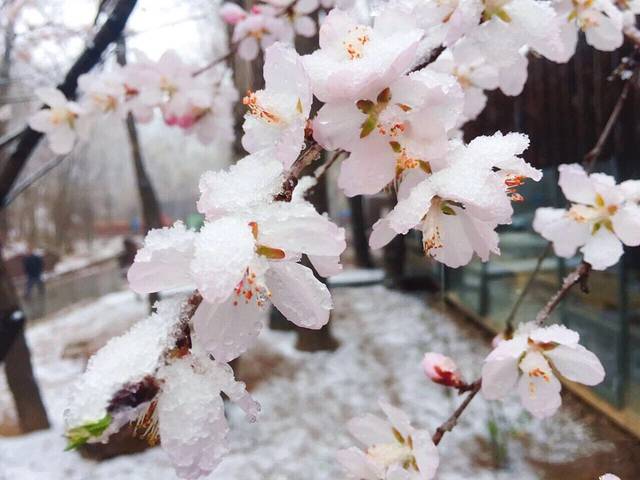 北京这周经历了春夏秋冬四个季节。周一夏天,周二秋天周三冬天。一个冬天基本没有下雪的北京,在春天来了以后,华丽丽的下雪了。所以便看到了雪出桃花,雪压柳树的景色。小坨早上迫不及待的就出去拍拍拍了。