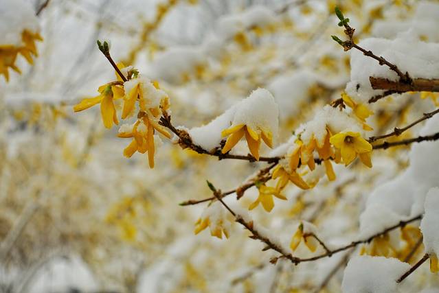 只把春来报的迎春花,如今被雪花压的抬不起头来。在雪地里如此绚丽夺目。