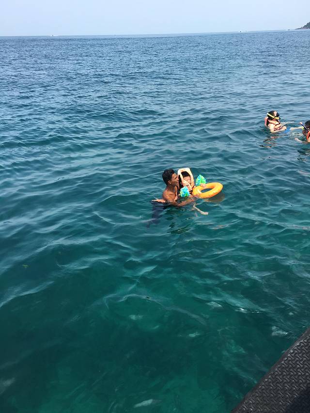 这里就是浮潜的地方了,我很久没有下水了,一看那水深的,自己没下水,倒是把娃给扔下水了哈哈,让小黑带他游一会,我拍几张照片,娃全副武装, 我欢乐的拍照,我妈躺船上命令我让船不要摇!!!