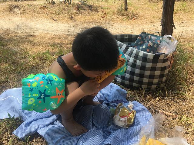 买了烤玉米,椰子,冷饮,娃吃完后继续吵着要游泳。这次他不怕水了,觉得水特别的舒服,天天吵着下水,不要回家了哈哈。