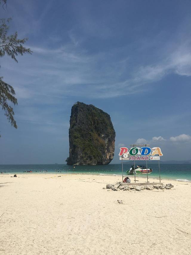美美的PODA Island,沙子很白,水质相当的好,整个海滩很大很大,我们下船的地方并非照片上的地方,从我们下船的地方走到照片上的地方10多分钟,当中有个像丛林一样的地方,没法走路,所以都是沿着海滩走的,那里小吃点只有一个,就在照片上这个地方。买东西的时候请自己看清价格,算好钱,那里一个小黑很坏,问了我是哪里人,我说我是中国人。然后明明100铢的冷饮,我买三个,给了他1000,他应该找我700,结果只找了600,还是边上一个好心的老外提醒我的,所以大家在钱方面一定要长一个心眼了。他们对待国人和老外的态度是不一样。当然小黑中也有好的啦,我一会会讲到他的。
